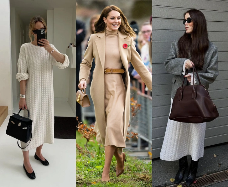По цветам зима 2026 года однозначно на стороне сложной нейтральной гаммы. Какао, молочный, шоколад, серый меланж, графит, темный оливковый — все эти оттенки делают трикотаж визуально дороже, а еще идеально сочетаются между собой. Если хочется, чтобы платье стало акцентом, пусть оно будет не в кричаще‑красном, а в глубоком винном или темно‑фиолетовом оттенке: в таком исполнении даже простой силуэт останется в категории «умной моды», а не импульсивной покупки с маркетплейса (читайте также: Главный цвет Парижской Недели моды — и как интегрировать его в свой гардероб).