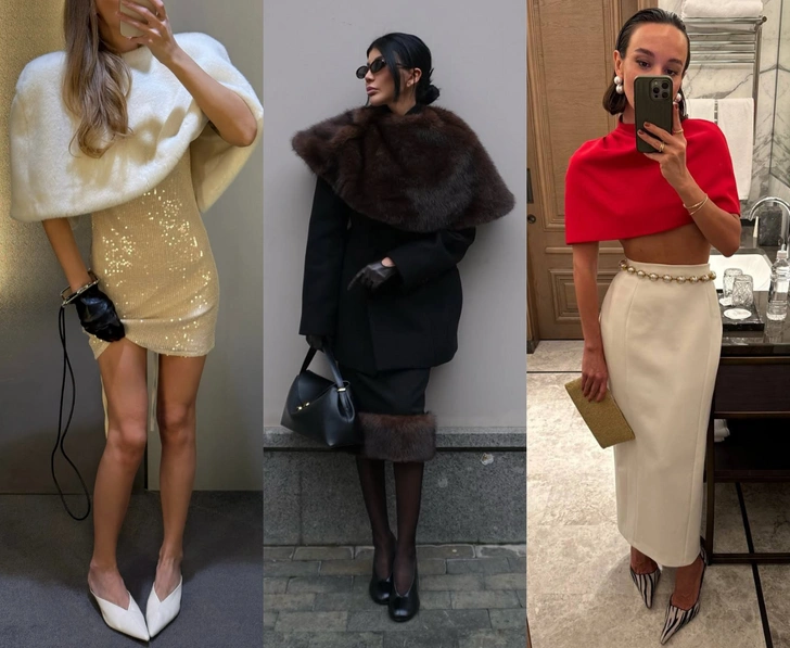 Укороченный кейп — идеальный партнер для платья, особенно если в планах вечерний выход или светское мероприятие. Любое мини с ним выглядит более благородно и собранно, а миди и макси в паре с кейпом визуально вытягивают силуэт и попадают в эстетику «тихой роскоши» в духе Роузи Хантингтон-Уайтли. Меховые модели превосходно «сотрудничают» с пайетками: они снимают избыточный глянец, добавляют образам глубины и статусности и, что не менее важно, — не отбирают у платья главную роль.