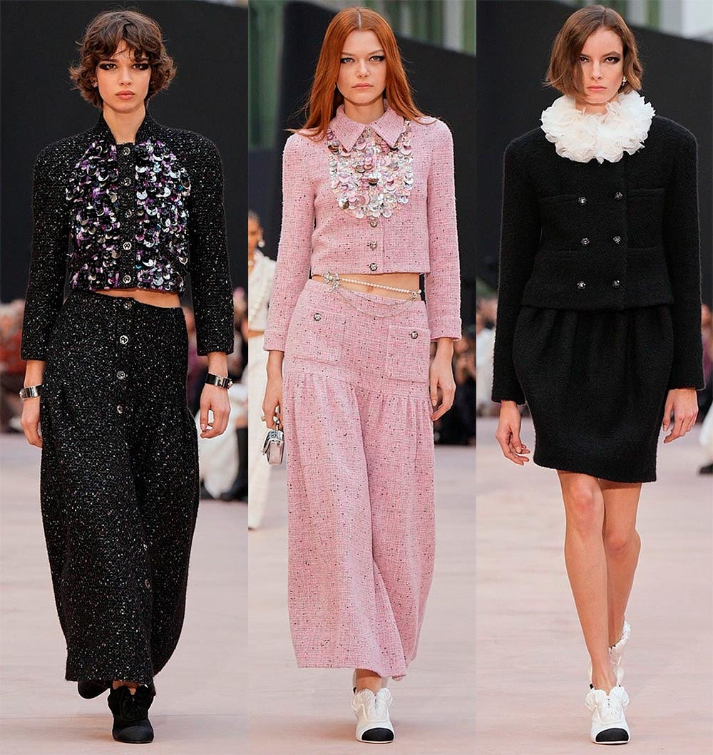 Сегодня дизайнеры предлагают выйти за рамки делового стиля. И конечно, обратимся к бренду Chanel, именно здесь можно найти такие костюмы. Костюм может быть и с юбкой мини, и с юбкой в пол, а твид, несомненно, тот материал, которому суждено быть в костюме. Мини-юбки подходят для создания смелых и экстравагантных образов, макси – идеально сочетаются с укороченными жакетами.